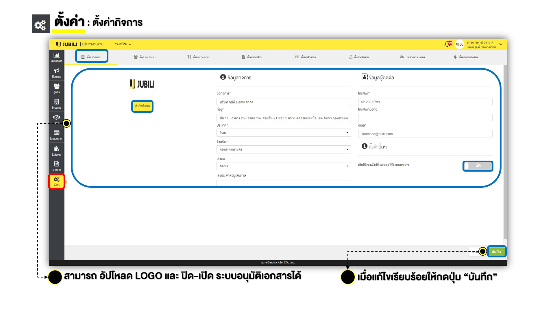 ตั้งค่ารายละเอียดข้อมูลของกิจการ ชื่อ ที่อยู่ โลโก้ของบริษัท
